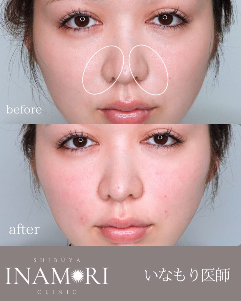 「超絶貴族セット」は、貴族ヒアルロン酸(鼻翼基部)とほうれい線ヒアルロン酸を同日にで行う渋谷いなもりクリニックのセットメニューです。鼻横の影を持ち上げ、ほうれい線の溝をやさしく和らげることで、口元〜鼻周りの立体感が整い、上品で自然な印象が期待できます。切らない注入治療のためダウンタイムは比較的短めですが、腫れや内出血、仕上がりには個人差があります。
